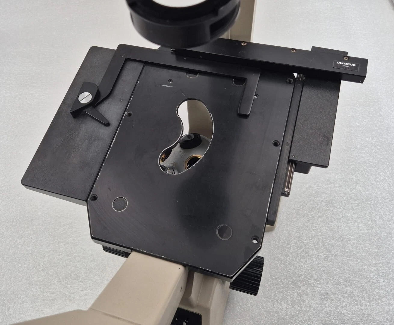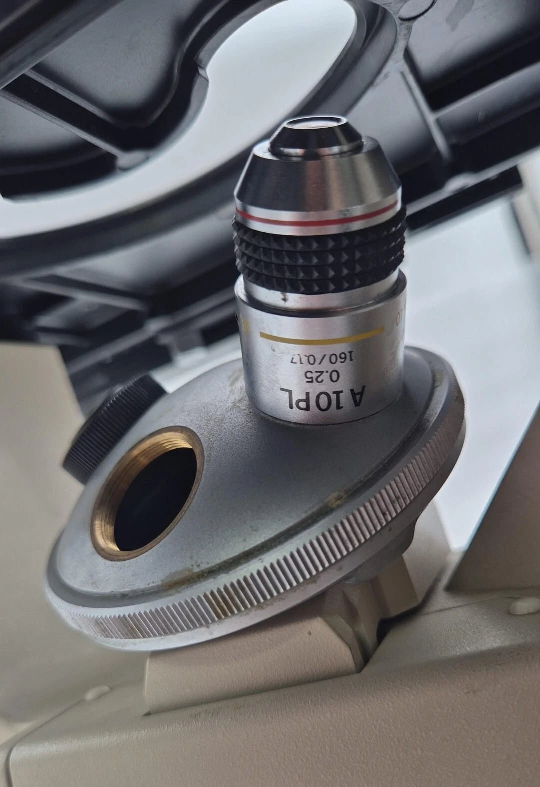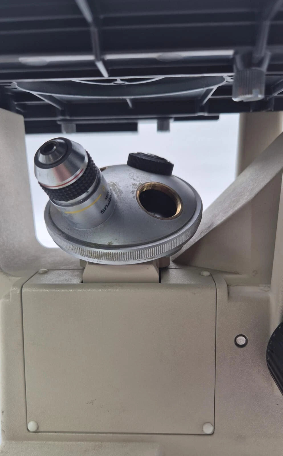 AS SEEN IN PICTURES. Powers up. Including lens Olympus A10PL 0.25 160/0.17. Table moves smoothly. Not including eyepiece. No bulb. Bulb's plastic housing is partially broken and not sitting properly. Not including filter. Not including optical tube.